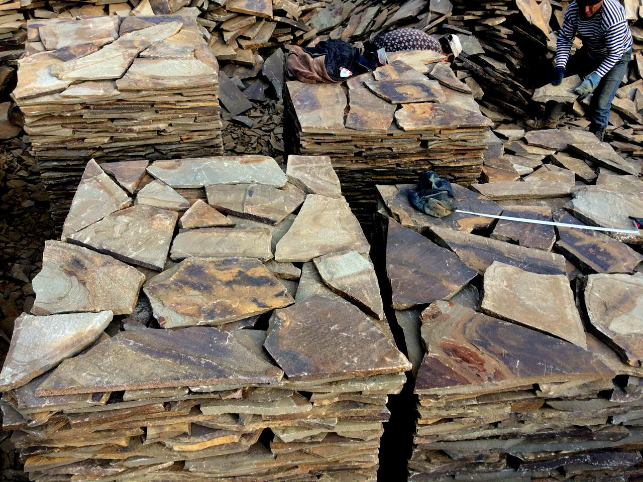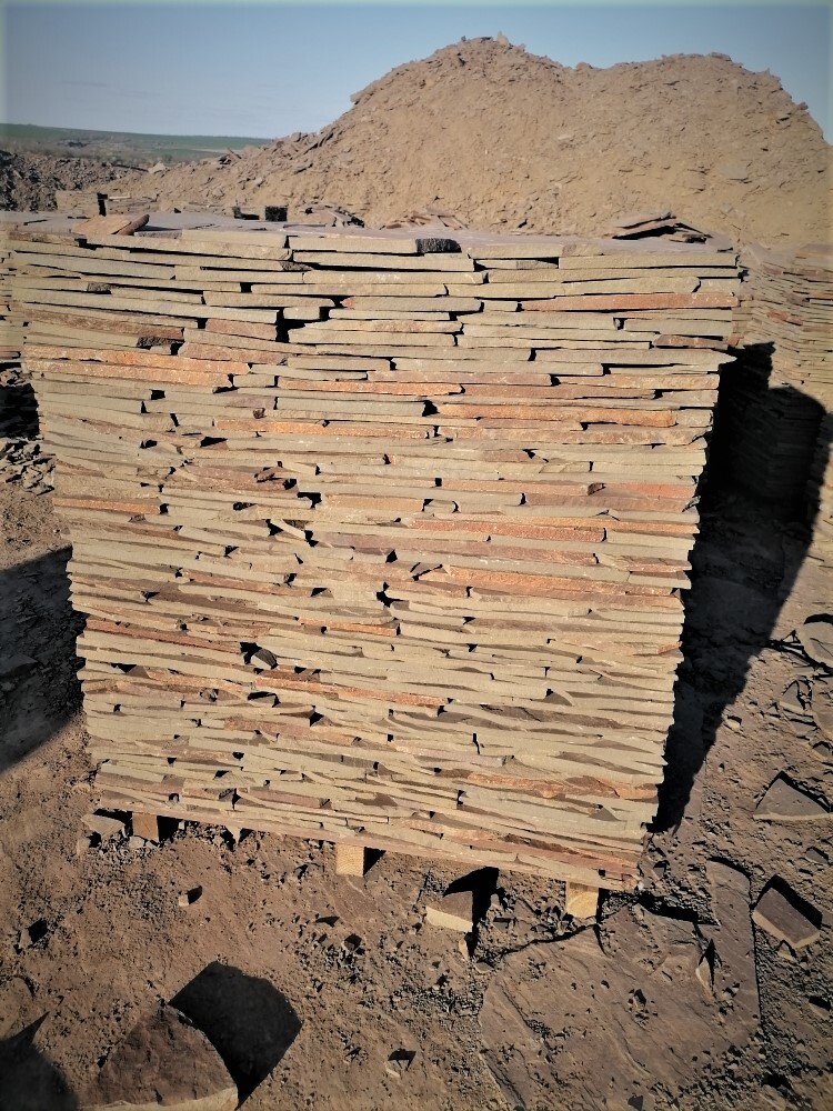 Процесс производства натурального природного камня - это очень тяжелый труд. Сначала натуральный природный камень надо вручную добыть на карьере, отсортировать по толщине и транспортировать в цех для дальнейшей обработки.